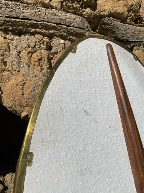 Υλικό: Σανίδες ξύλου βελανιδιάς, άξονας καρυδιάς, oρειχάλκινο γείσο, σιδερένιος ομφαλός, λινό, δέρμα, Βάρος: ≈2.7 kg , Ύψος: 1.2 m, Πλάτος: 0.6m